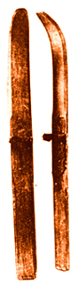 "They (the mountain men) take two wooden boards, one quarter of a 'thumb' thick, half a foot wide and about five feet long. In front the boards are turned upwards. In the middle there is a leather strap for keeping feet in place. The person steps onto the 'smuči', and takes a strong staff into his hands. This he puts under his arm and leans back into it, using it as support and as rudder, and so he slides or better flies down the steepest slopes. While standing on the boards, he leans firmly on the staff, and runs down hill so fast that he certainly goes faster than the over the ice in Holland. Every moment he is able to avoid anything that stands in his way, a tree, a rock or anything else. No hill is too steep for him, none so thickly wooded, that he would not be able to slide through in this manner. He is able to avoid anything by making his way around it like a snake. However, when the way is free and clear of any obstacle, he rushes along in a straight line, always standing straight and leaning on his staff."