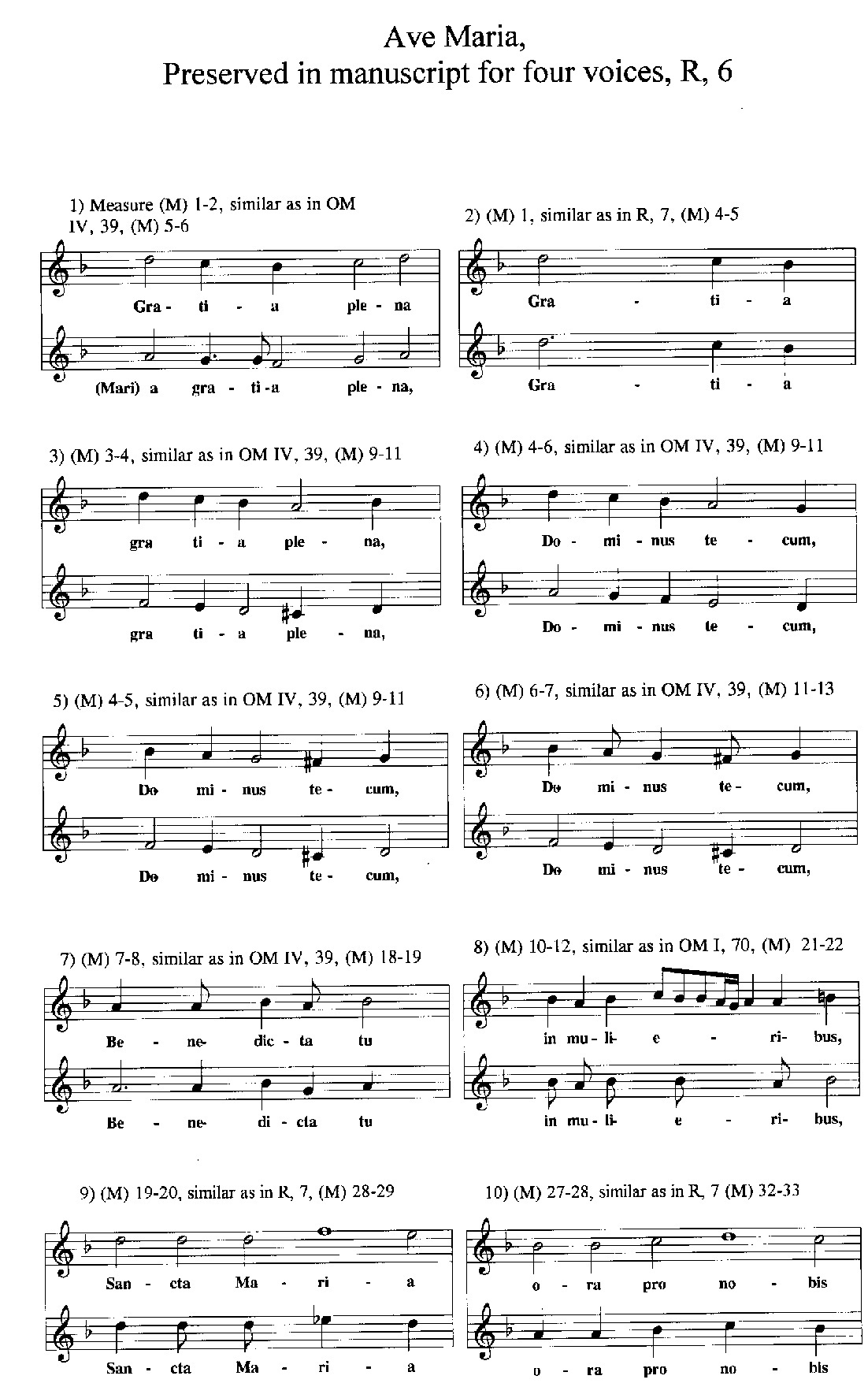 15) This motet has many melodic variants in common with the motet for six voices (from the same archive) and the Ave Marias published in the Opus Musicum, I.70; IV.39, (but not to the composition OM IV.73). In the attached sample of measures a comparison is made between the motets for four and six voices, with two of the motets established to be by Gallus). Meanwhile there is no musical similarity between Victoria's motet for eight voices and the manuscript Ave Maria motet for four.