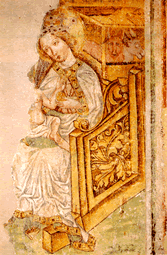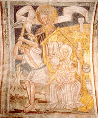 In the middle arch of the nave we see the figure of Mother Eve, bursting with life-giving energy. She sits in the centre of her home, suckling two infants and spinning. In this way Eve of Hrastovlje represents various aspects of the Goddess. She is the Goddess of Abundance of Life. Seated in the centre of her home, she symbolizes the axis, around which are placed all possible dimensions of creation – the axis of the world. As the suckling mother, she embodies the source of unlimited fertility and plenty. Spinning the thread and turning the spindle, she shares with all manifested beings their fate, while she guides them through life, death and birth.