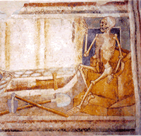 On the south wall of the side aisle there is a representation of Death Dance. The pageant of living humanity and the dead contains eleven skeletons, moving from east to west, in the direction of the setting sun. There, at the end of the line sits a skeleton, in a desolate and bleak winter landscape, on a crude stone throne. As the Goddess of Death and Transformation, the skeleton holds a gravestone tablet over an open grave, as if to invite the humans to proceed on the path to the grave. The Goddess of Death and Transformation rules over the winter, when life withdraws into its phase of decay and renewal. In the church of Hrastovlje the procession of the dead is beckoning mankind into the depth of the grave, that is, onto the fearsome path through the underworld - to submit to the process of transformation, which will lead through death into a renewed beginning.