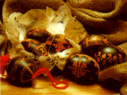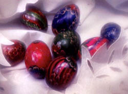 The Easter egg was originally coloured with natural colours from plants; at first only red and yellow colours were used. The following plants were used; for red, decoction of Brazilian wood, for yellow, saffron or barberry root, for greyish-red, alderwood and cherrytree bark, for black, alder-wood and cherrytree bark, for brown, onion skin leaves. Nowadays chemical colouring is also used. After colouring or decorating the egg, the egg is polished with either the skin from bacon or an oiled cloth. With eggs, which are coloured with at least two colours, the whole process may be repeated at least twice.There are two basic techniques of colouring and decoration: colouring or drawing a pattern with warmed wax, "batik" technique, and scratching a design with a sharp cutting blade on the coloured egg.