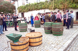 a wooden winepress, the weighing of grapes and establishing